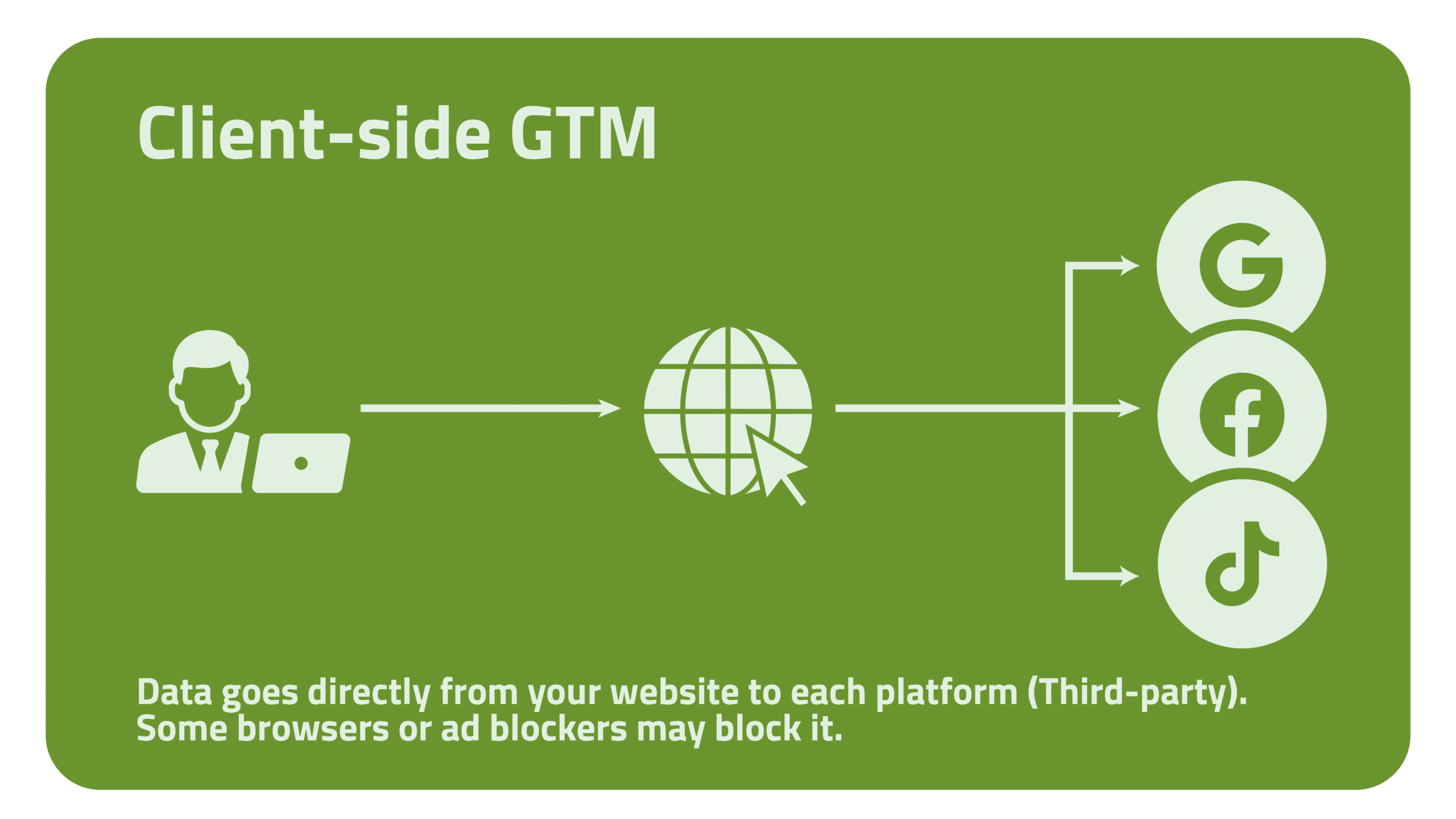 Client-side GTM je najčešće korišteni i najjednostavniji oblik praćenja. Svi tagovi (npr. za Google Analytics, Meta Pixel, TikTok Pixel) učitavaju se izravno u pregledniku korisnika.
