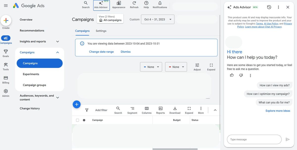 Instead of the traditional click-and-search approach, there is now an AI assistant built directly into the Google Ads interface.